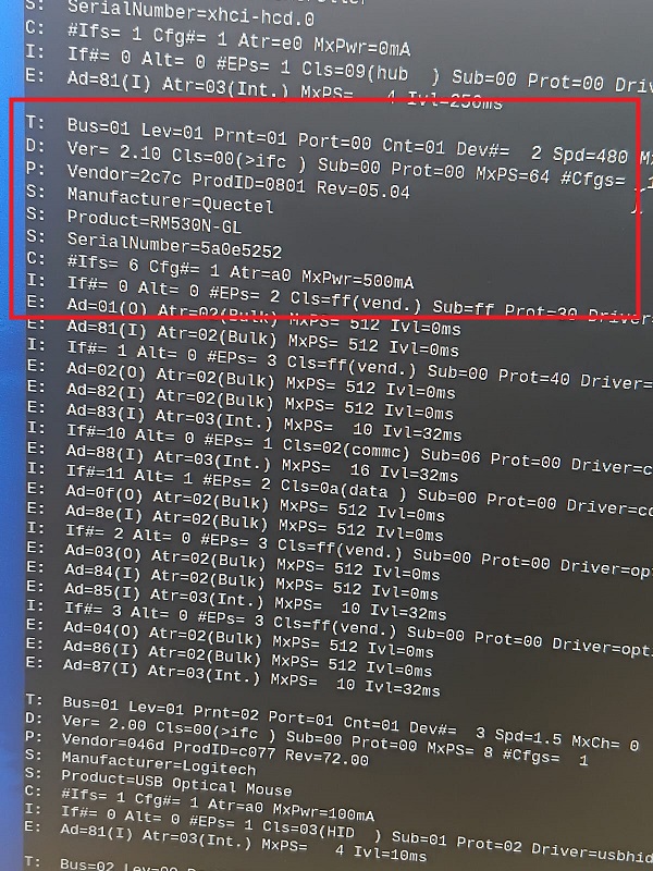 Information about Quectel and device model RM50N-GL should be display (click to enlarge):Note: Quectel modems usually expose multiple interfaces, each for different purposes: (for AT command setup, we'll be using ttyUSB2)